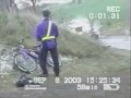 Un pequeño auto intenta subir una colina con una casa rodante.