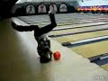 Mientras baila break dance, este joven juega bolos y hace un chuza.